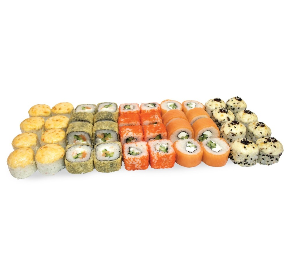 Ролл Филадельфия, ролл Креветка Калифорния, ролл Вулкан спайси эби запеченный, ролл Бостон темпура, ролл запеченный с копченой курицей и грибами
