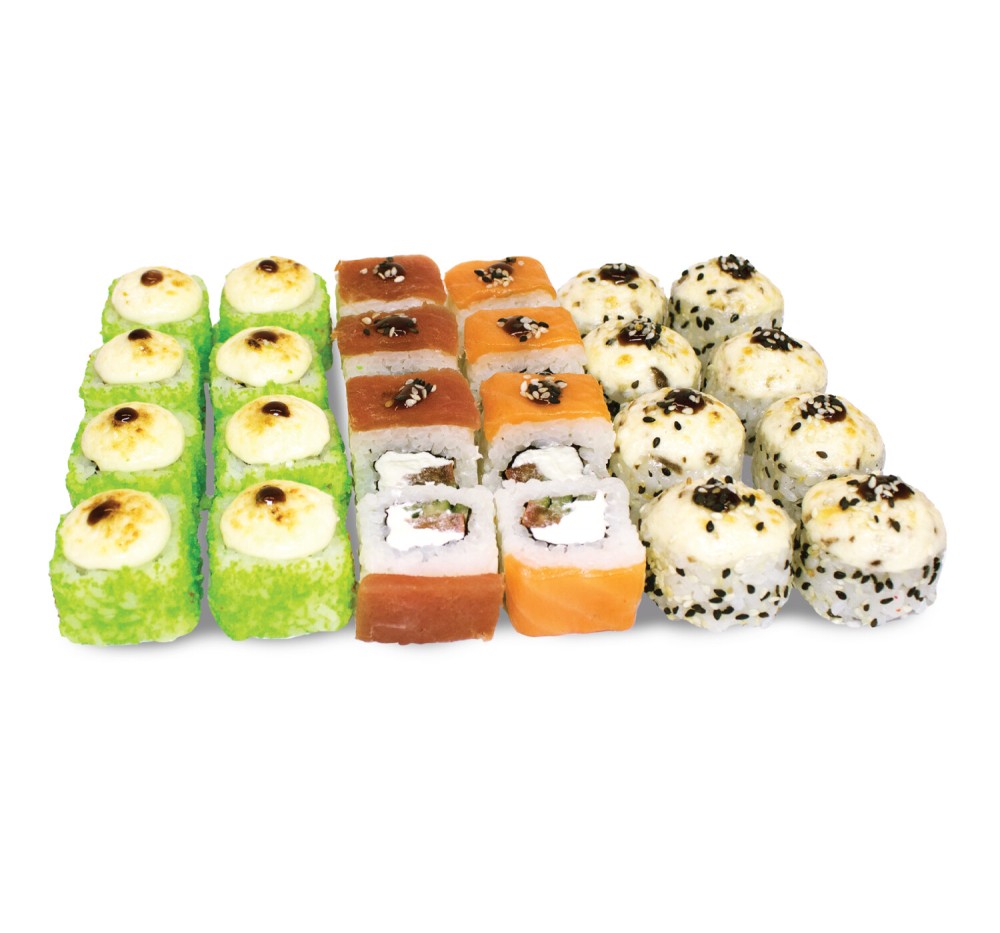 Ролл запеченный с копченой курицей и грибами, ролл запеченный Калифорния чиз Креветка, ролл Азия