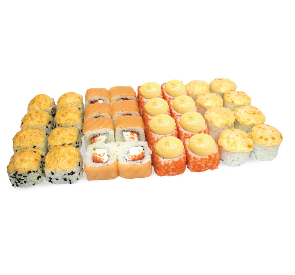Ролл Острая Филадельфия, ролл спайси Угорь Калифорния, ролл Вулкан спайси с курицей запеченный, ролл Луи Креветон