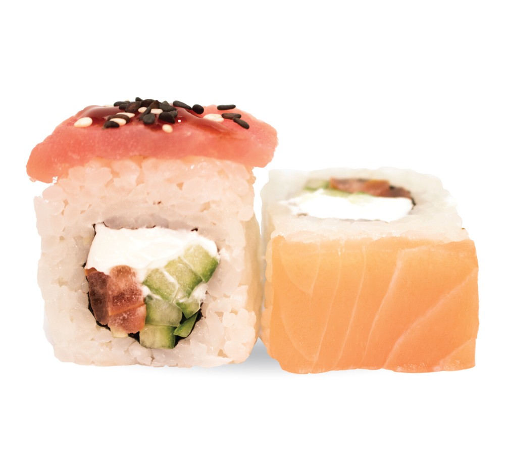 лосось, тунец, сыр сливочный, огурец, помидор, соус унаги, кунжут