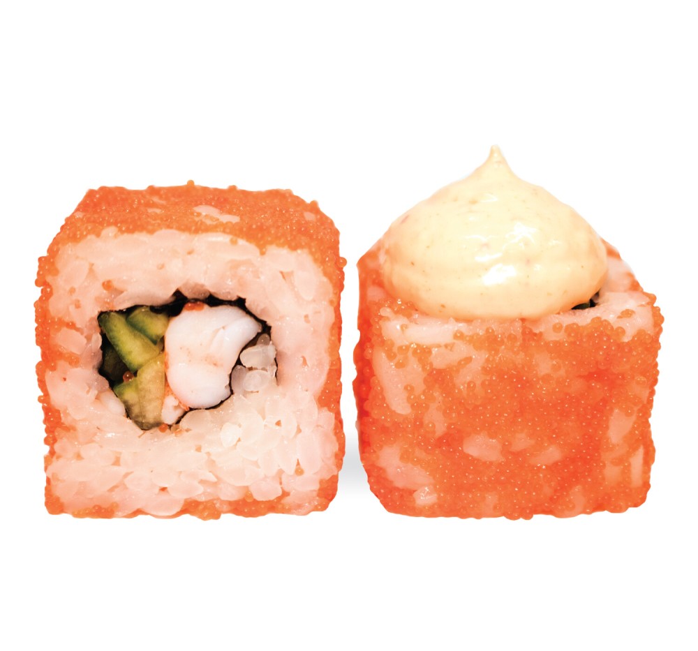 тигровая креветка, соус спайси, огурец, масаго оранжевая