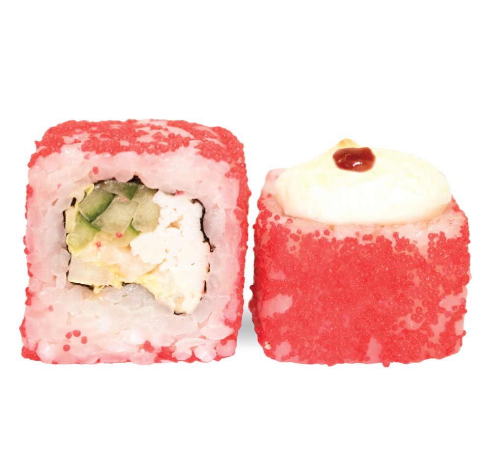 крабовая палочка, соус спайси, соус японский, огурец, капуста пекинская, масаго красная, соус сырный, соус унаги