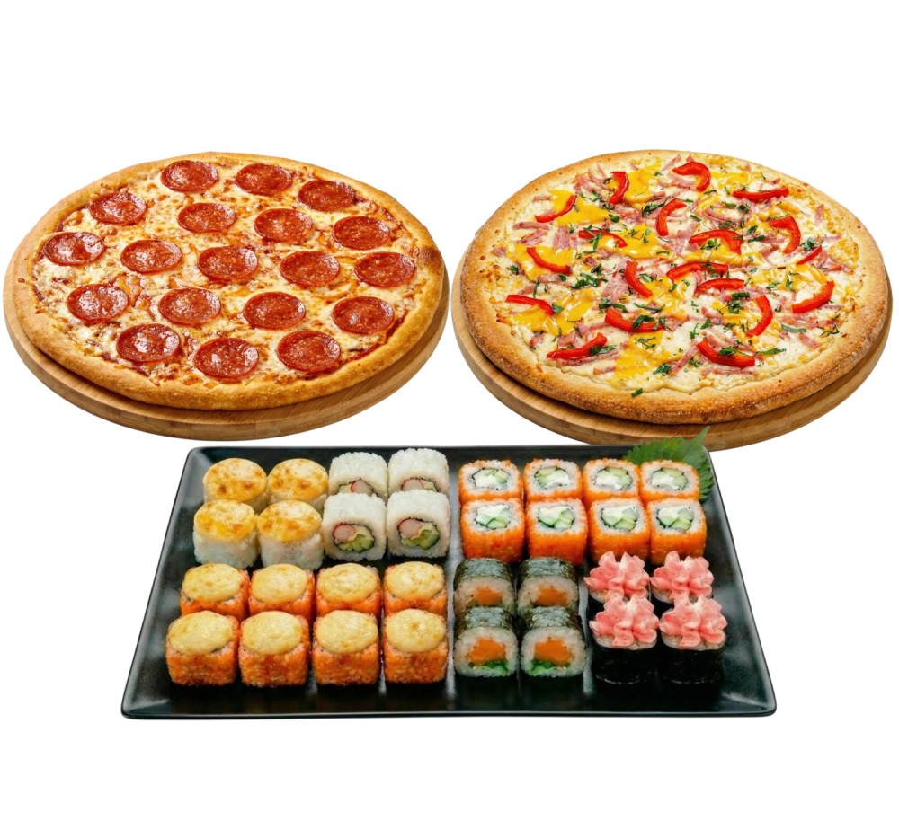 Пицца Папа Ранч 32 см (ветчина, сыр чеддер, сыр моцарелла, перец болг, соус бургер, соус белый, чесночное масло, зелень); Пицца Мистер пепперони 32 см (колбаса пепперони, сыр мацарелла, соус красный, зелень); Ролл Фишкейк (лосось, водоросли чука, соус лава) 8 шт; Ролл Креветка Калифорния (тигровая креветка, масаго оранж, огурец, соус японский ) 8 шт; Ролл Дзенин (крабовая палочка, омлет японский, соус мотояки, соус японский, огурец, сухари панко) 8 шт; Ролл Тори кинг (куриная грудка х\к, масаго оранж, перец болг, соус мотояки, омлет японский, кунжут) 8 шт