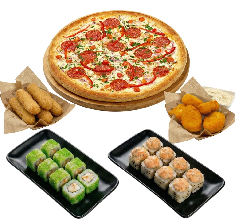Пицца Аррива 32 см (колбаса пепперони, курица жареная, сыр моцарелла, перец болгарский, помидор, лук маринованный, соус белый, соус бургер, чесночная заправка, зелень); Ролл Шанхай с лососем (лосось, сыр сливочный, омлет японский, огурец, соус спайси, кунжут) 8 шт; Ролл Эби грин маки (креветка тигровая, соус японский, огурец, сыр сливочный, масаго зелёная) 8 шт; Сырные палочки (сыр моцарелла); Наггетсы с белым соусом