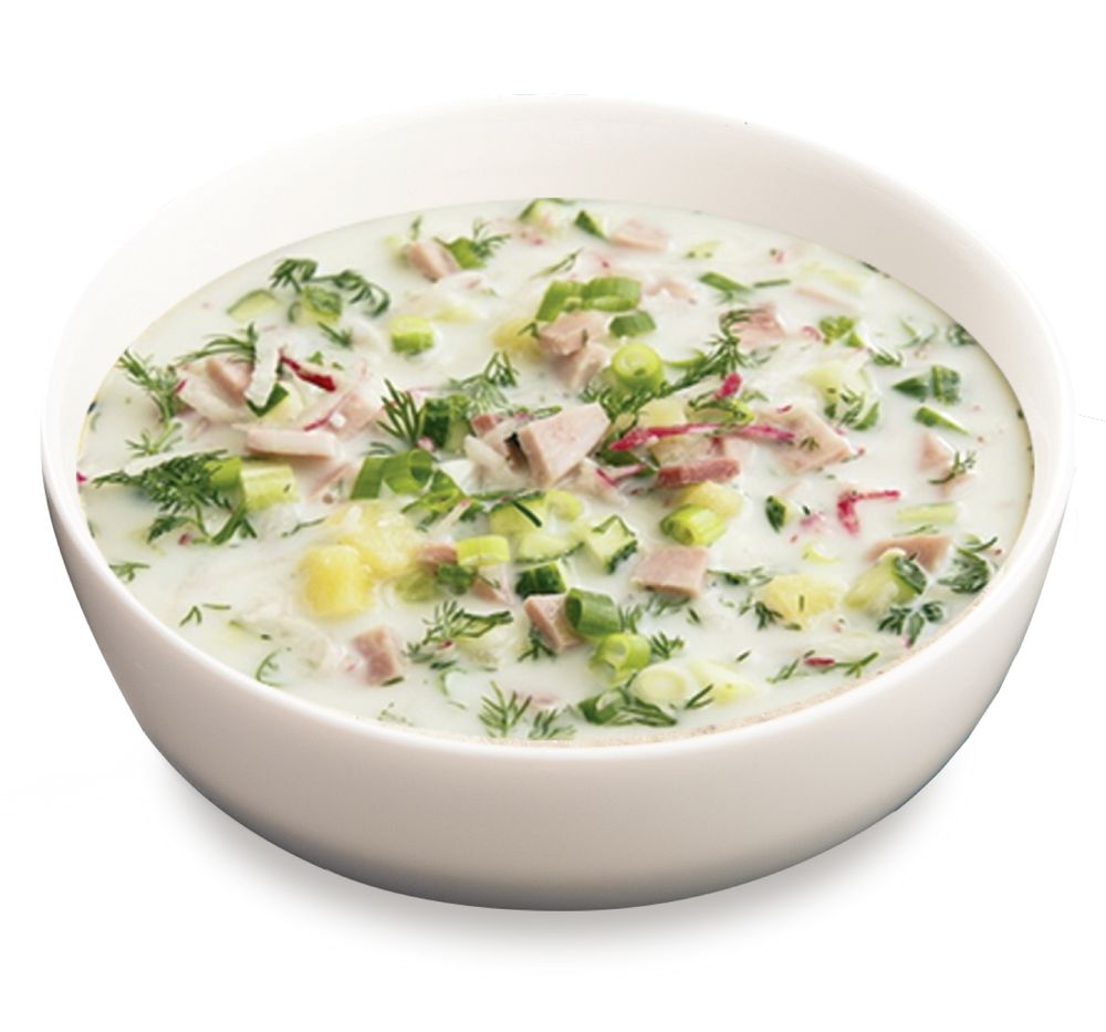 ветчина, огурец, яйцо, редис, картофель, кефир, тан, минеральная вода, сметана, майонез, хрен, горчица, зелень