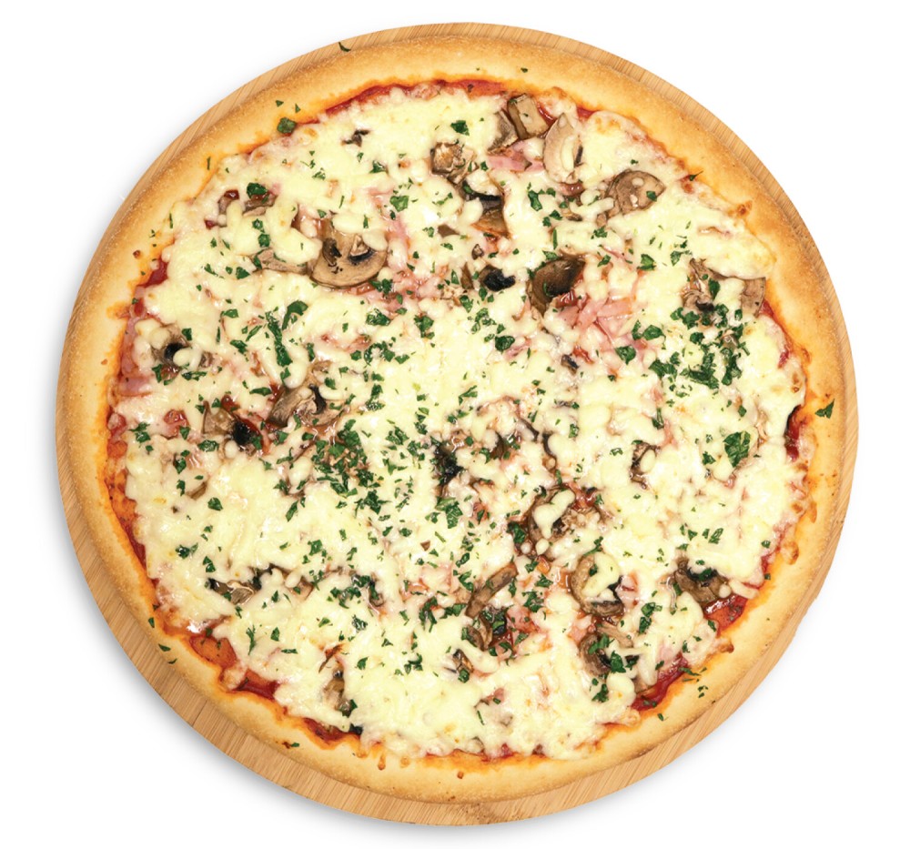 ветчина, грибы шампиньоны, сыр Моцарелла, соус красный, зелень