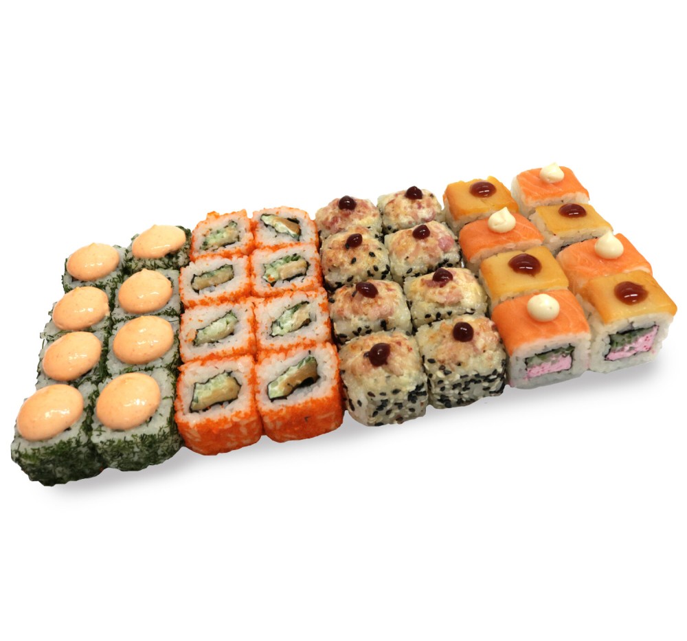 Ролл Калифорния креветка, ролл Фудзи запечённый, ролл Дуэт, ролл острый краб