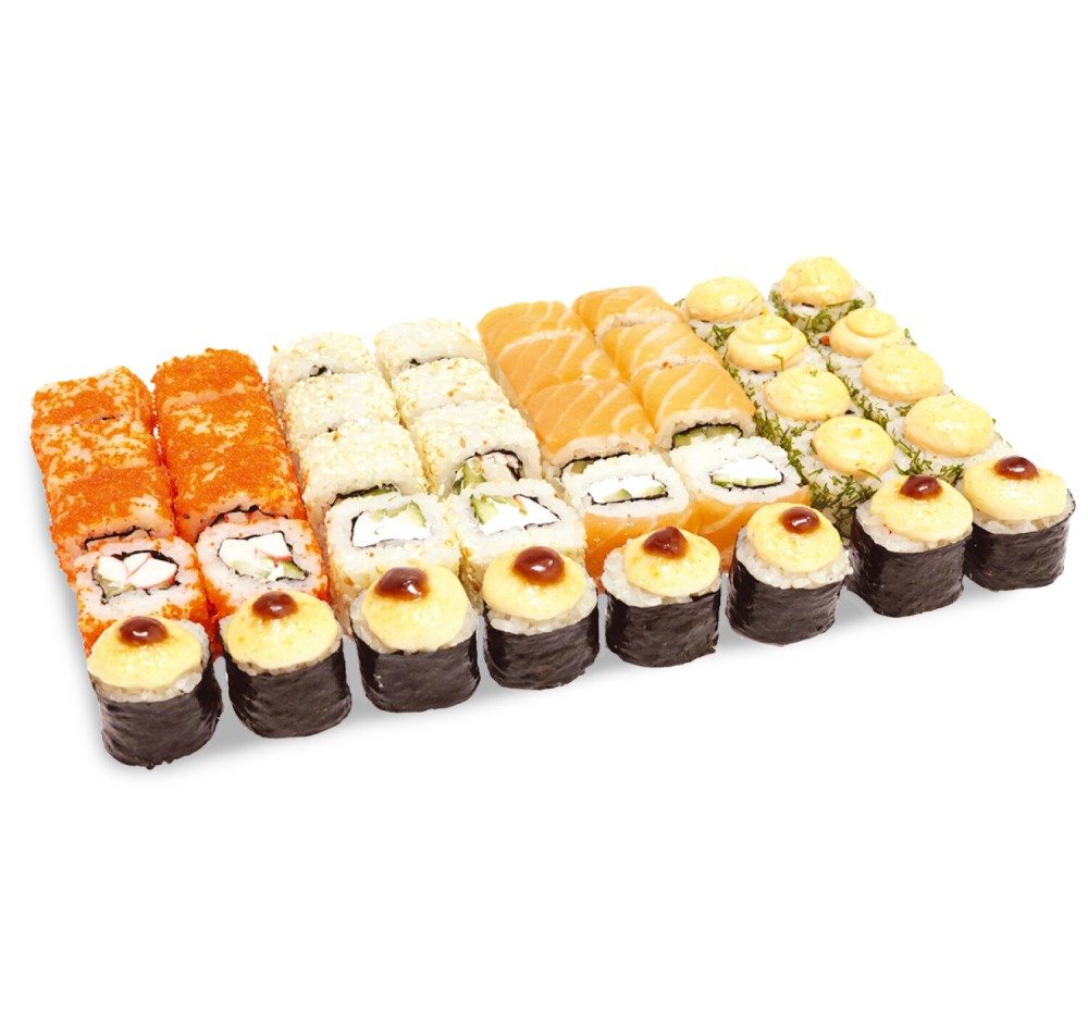 ролл Филадельфия лайт, ролл Сливочная креветка, ролл Калифорния краб, ролл Острый лосось, ролл Чикен чиз запечённый