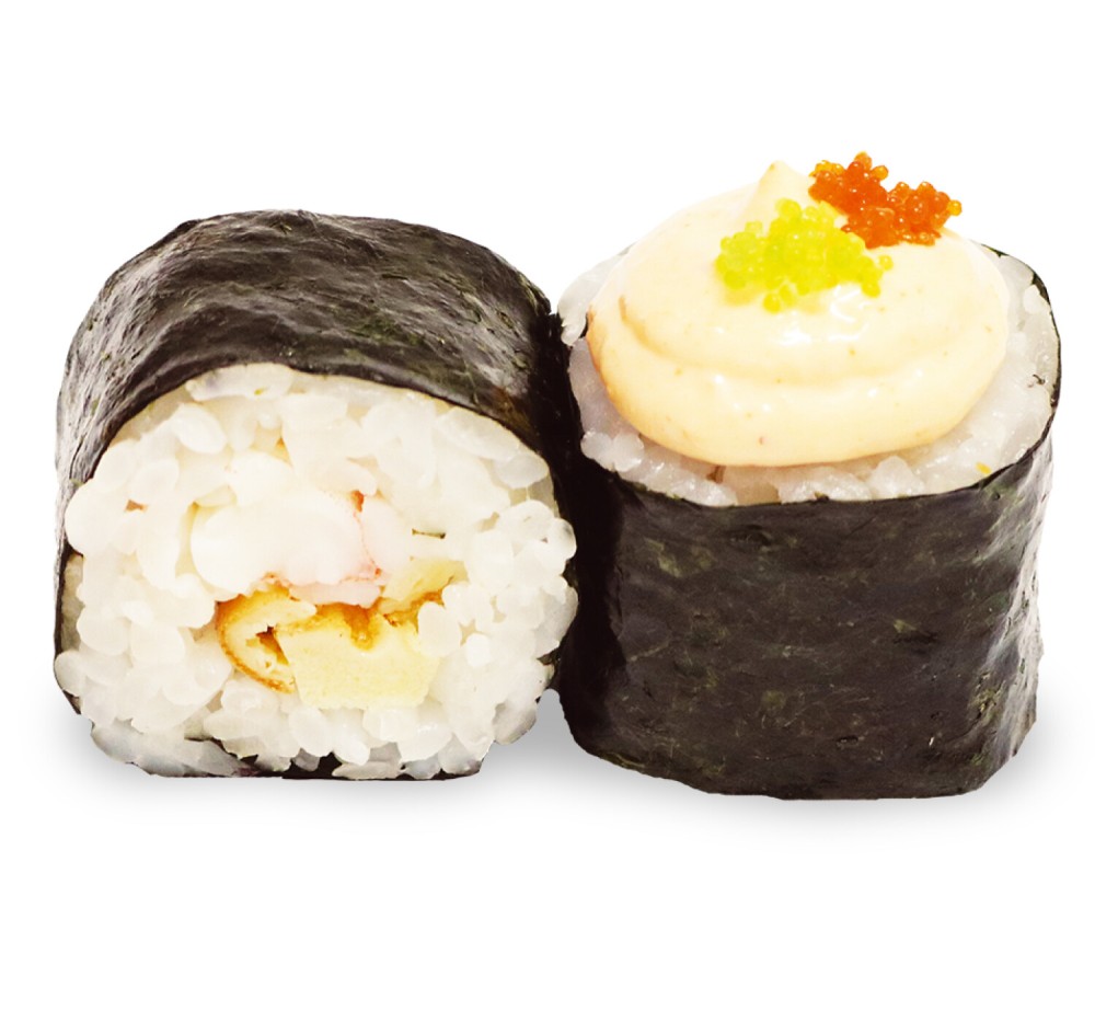 тигровая креветка, омлет японский, соус Спайси, масаго оранжевая, масаго зелёная