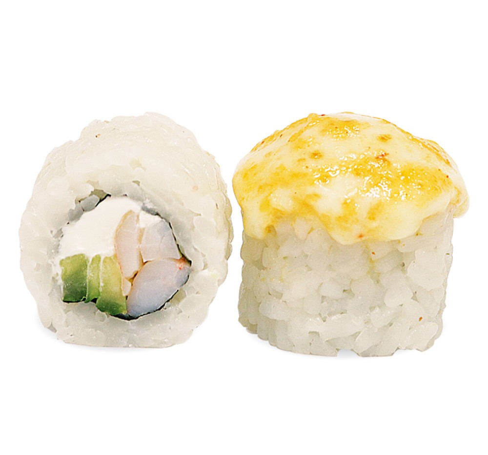 креветка тигровая, сыр сливочный, огурец, Спайси соус, сыр Моцарелла