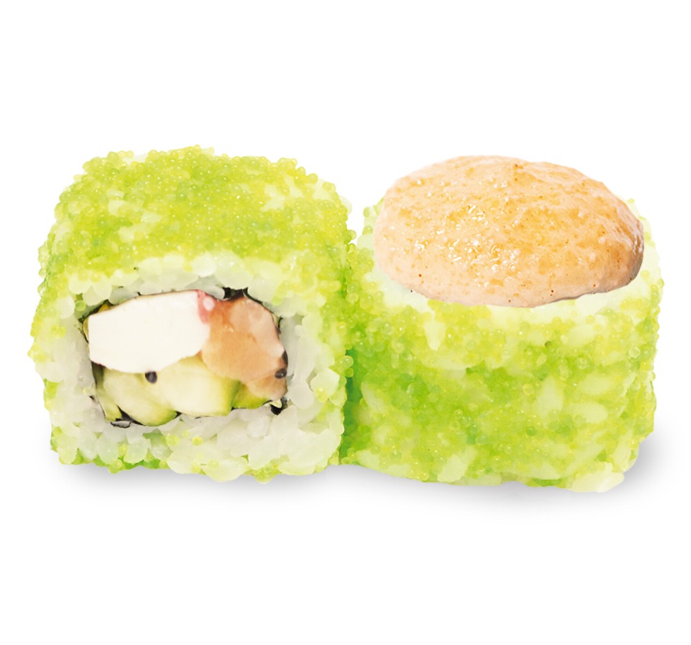 Лосось, крабовая палочка, масаго зелёная, соус мотояки, соус Японский, огурец