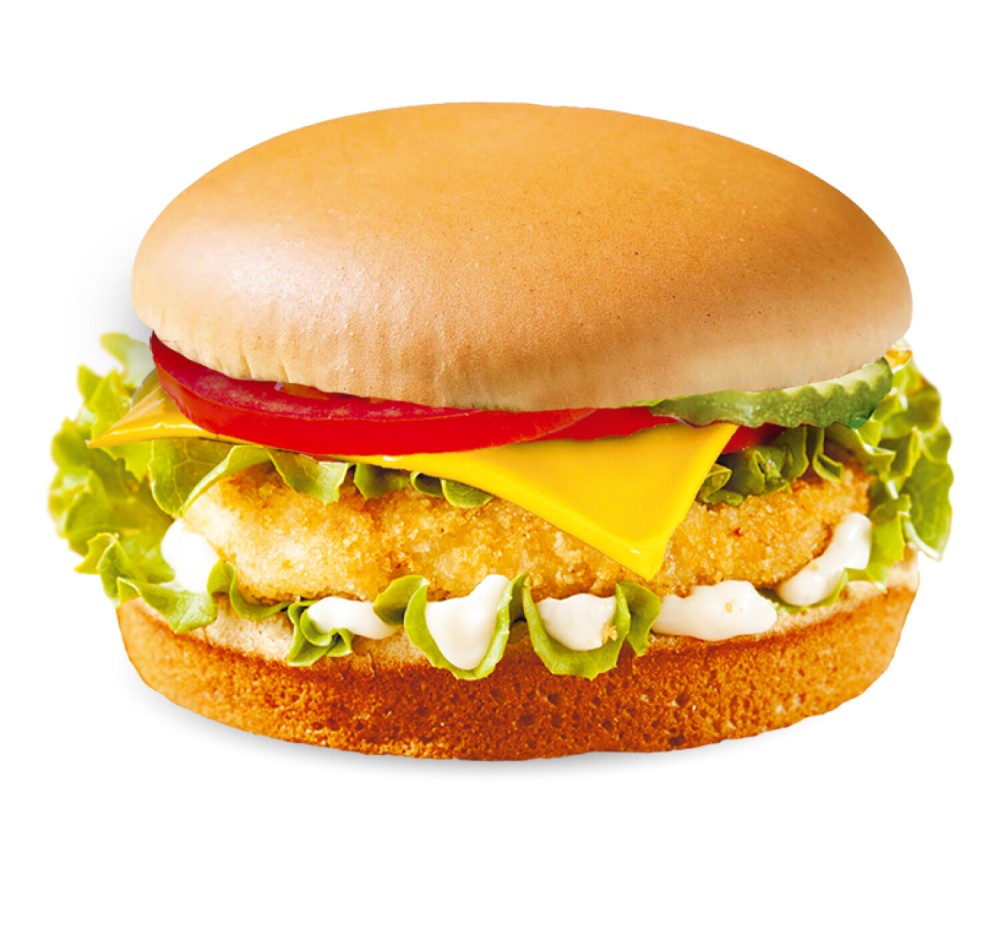 Булочка, салат айсберг, помидор, огурец маринованный, соус белый, сыр Чеддер, котлета куриная