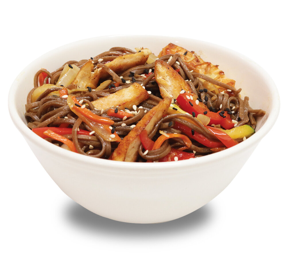 куриное филе, цукини, перец болгарский, морковь, лук, капуста пекинская, лапша соба, кунжут, заправка Вок