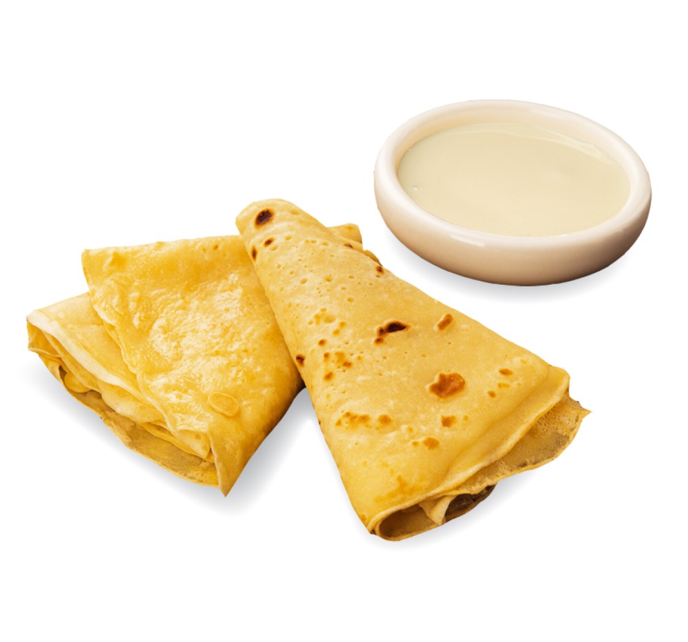 Тонкие румяные блины с тягучей сладкой сгущёнкой.